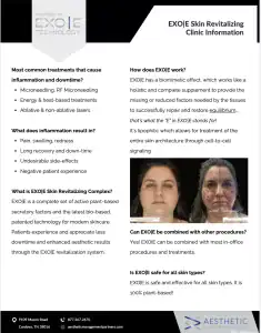 Along with the Clarify, Vivify, Detox and Defy, we use professional application of the proprietary plant based serums EXO|E “Putting the science of nature to work” to support the skin to have less downtime and enhanced results immediately after the treatment. Watch video below to learn and see images of patient results with EXO|E.