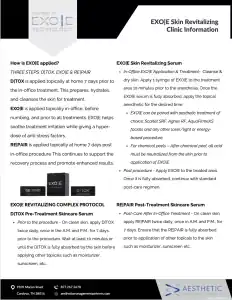 Along with the Clarify, Vivify, Detox and Defy, we use professional application of the proprietary plant based serums EXO|E “Putting the science of nature to work” to support the skin to have less downtime and enhanced results immediately after the treatment. Watch video below to learn and see images of patient results with EXO|E.